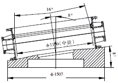 蝶板組合件起密封作用的零件是密封圈,密封圈為斜錐結(jié)構(gòu),其錐頂角為16°,厚度為13.5mm,由5層石棉板及4層不銹鋼板復合而成(圖6)。密封圈必須與蝶板和壓環(huán)等組裝在一起,加工時才能防止密封圈夾層中的不銹鋼板及石棉板翹曲變形。根據(jù)其結(jié)構(gòu)特點,對蝶板組合件密封圈采用以下加工方法:(1)先在2.5m立車上分別把蝶板和壓環(huán)上的各止口加工到圖紙要求尺寸,外圓不加工;(2)按圖紙要求對壓環(huán)鉆孔,蝶板鉆孔攻絲;(3)壓環(huán)、密封圈和蝶板按圖紙裝配,將蝶板組合件工裝用螺栓緊固在閥體工裝上,然后再將蝶板組合件裝夾其上。立車刀桿旋轉(zhuǎn)8°車壓環(huán)、密封圈和蝶板至磨削尺寸;⑷用同樣厚度鋼板替下密封圈,車壓環(huán)、蝶板各錐面至圖紙尺寸;(5)工裝不動,將壓環(huán)、密封圈、蝶板重新按要求組裝,然后在立車刀架上裝磨頭,對密封圈進行磨削處理,使其達到圖紙設(shè)計粗糙度要求。